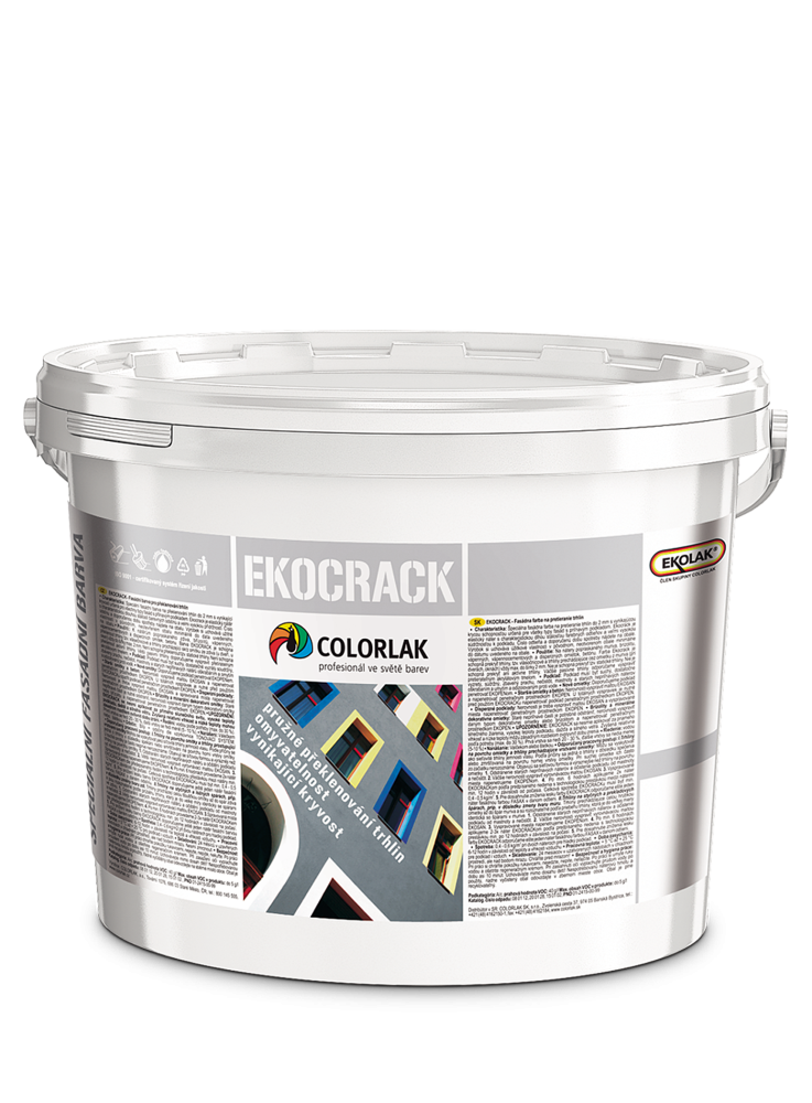 EKOCRACK je disperzná špeciálka na preklenovanie trhlín do šířky 2 mm a je vhodná na všetky typy fasád s priľnavým povrchom, kde vytvára elastický náter s charakteristickou veľmi vysokou prídržnosťou na popraskanom murive, brizolite, vápenných, vápennocementových, disperzných a silikónových omietkach, betónu.