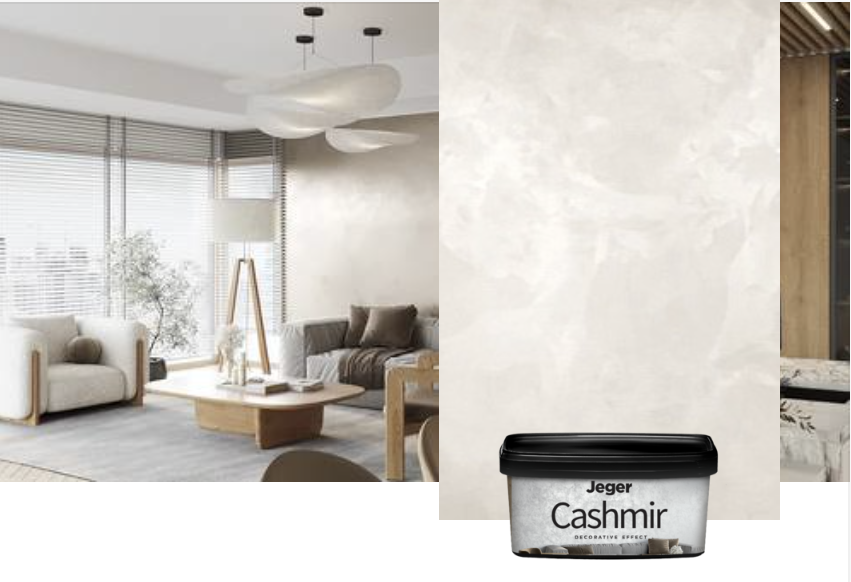 Jeger Cashmir je jedinečný dekoratívny efekt, ktorý na stenách vytvára dojem jemnej mäkkosti, zvýraznený jemným perleťovým leskom. Jeger Cashmir nie je len dekoráciou na stenu, ale skutočnou cestou do sveta rafinovanej elegancie. Vášmu interiéru dodá jedinečný charakter a šarm a jemný perleťový lesk sa stane výnimočným akcentom každého priestoru. Tento dekoratívny efekt podčiarknutý perleťovým leskom vnesie do vášho interiéru atmosféru útulnosti a uvoľnenia. Toto riešenie sa hodí do interiérov v rôznych štýloch, od klasických až po moderné. Dokonale sa hodí k minimalistickým aranžmánom a klasickým priestorom dodá eleganciu.
