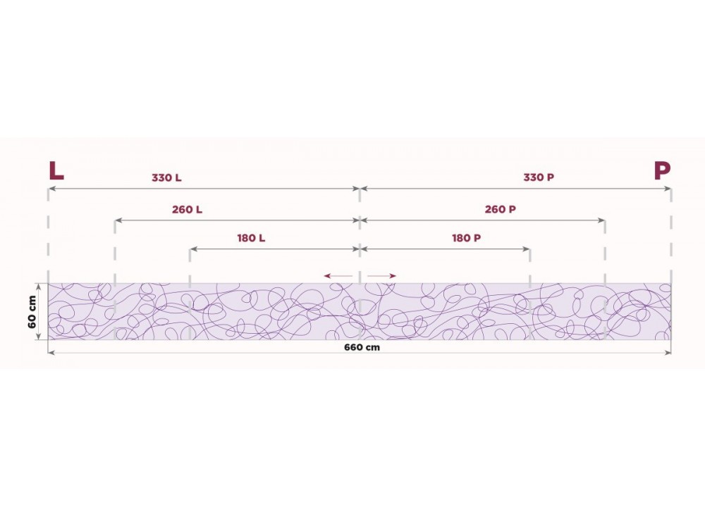 Dôležité je aby ste si všimli linky, ktoré delia fototapetu. Každá časť je označená dĺžkou fototapety a stranou L - ľavá a P - pravá.