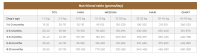 Bielkoviny 28,5 %; Oleje a tuky 16,5 %; Vláknina 1,7 %; Popol 6,3 %; Vápnik 1,4 %; Fosfor 1,1 %; Omega-3 0,4 %; Omega-6 1,4 %.